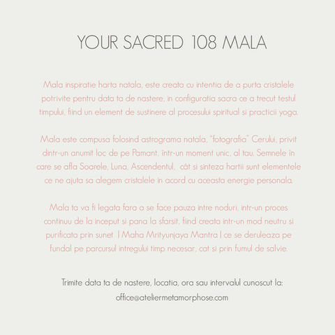 Mala „Inspirație Hartă Natală” este creată cu intenția de a purta cristalele potrivite pentru data ta de naștere, în configurația sacră care a trecut testul timpului, fiind un element de susținere în procesul spiritual și în practica yoga.